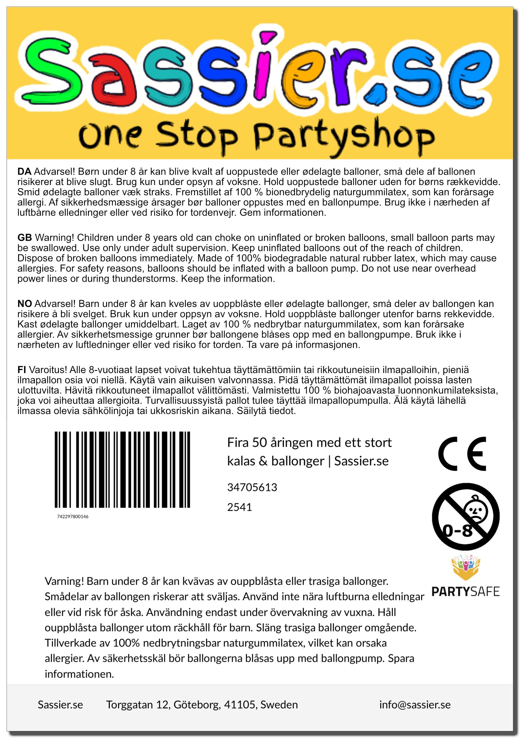 | VARNING! | Barn under 8 år kan kvävas av ouppblåsta eller trasiga ballonger. Användning endast under övervakning av vuxna. Håll ouppblåsta ballonger utom räckhåll för barn. Släng trasiga ballonger omgående. Tillverkade av 100% nedbrytningsbar naturgummilatex, vilket kan orsaka allergier. Av säkerhetsskäl bör ballongerna blåsas upp med ballongpump. Smådelar av ballongen riskerar att sväljas. Använd inte nära luftburna elledningar eller vid risk för åska. |