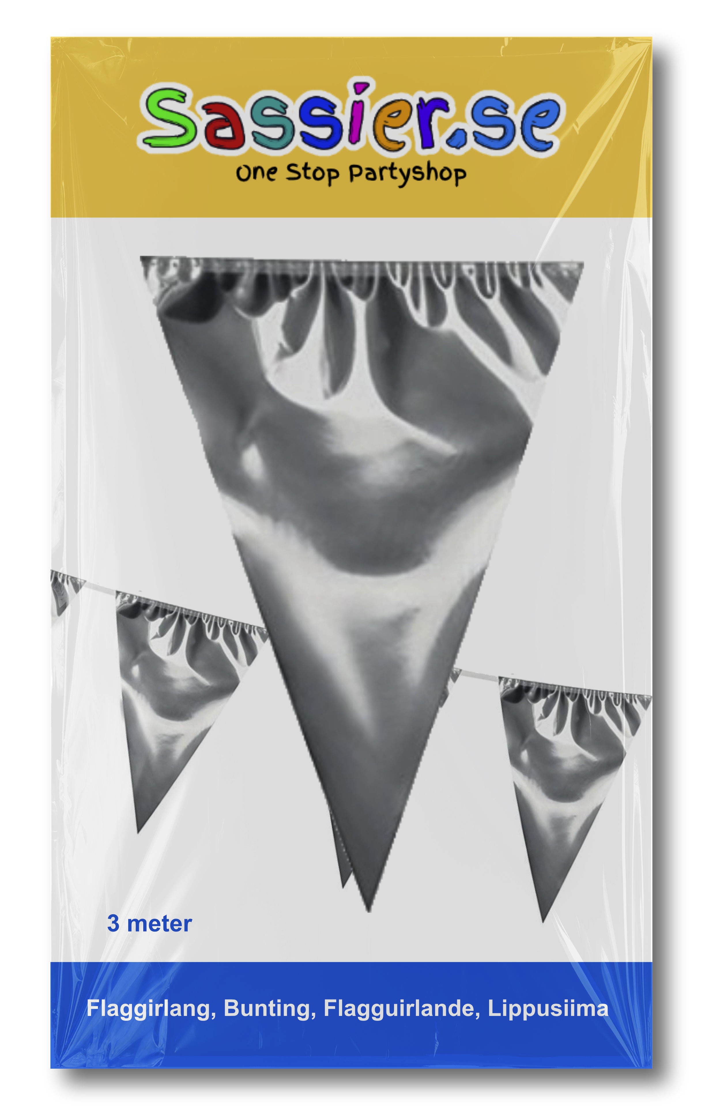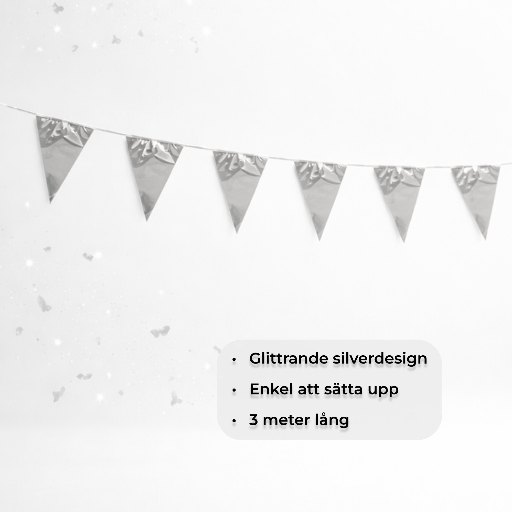 Silverfärgad vimpelgirlang är en glittrande festdekoration i silver som skapar rätt stämning på allt från studentfirande till nyårsfest. Den reflekterar ljus och ger rummet en tydlig partykänsla – både inomhus och utomhus. En praktisk och återanvändbar girlang för dig som vill dekorera enkelt men effektfullt.