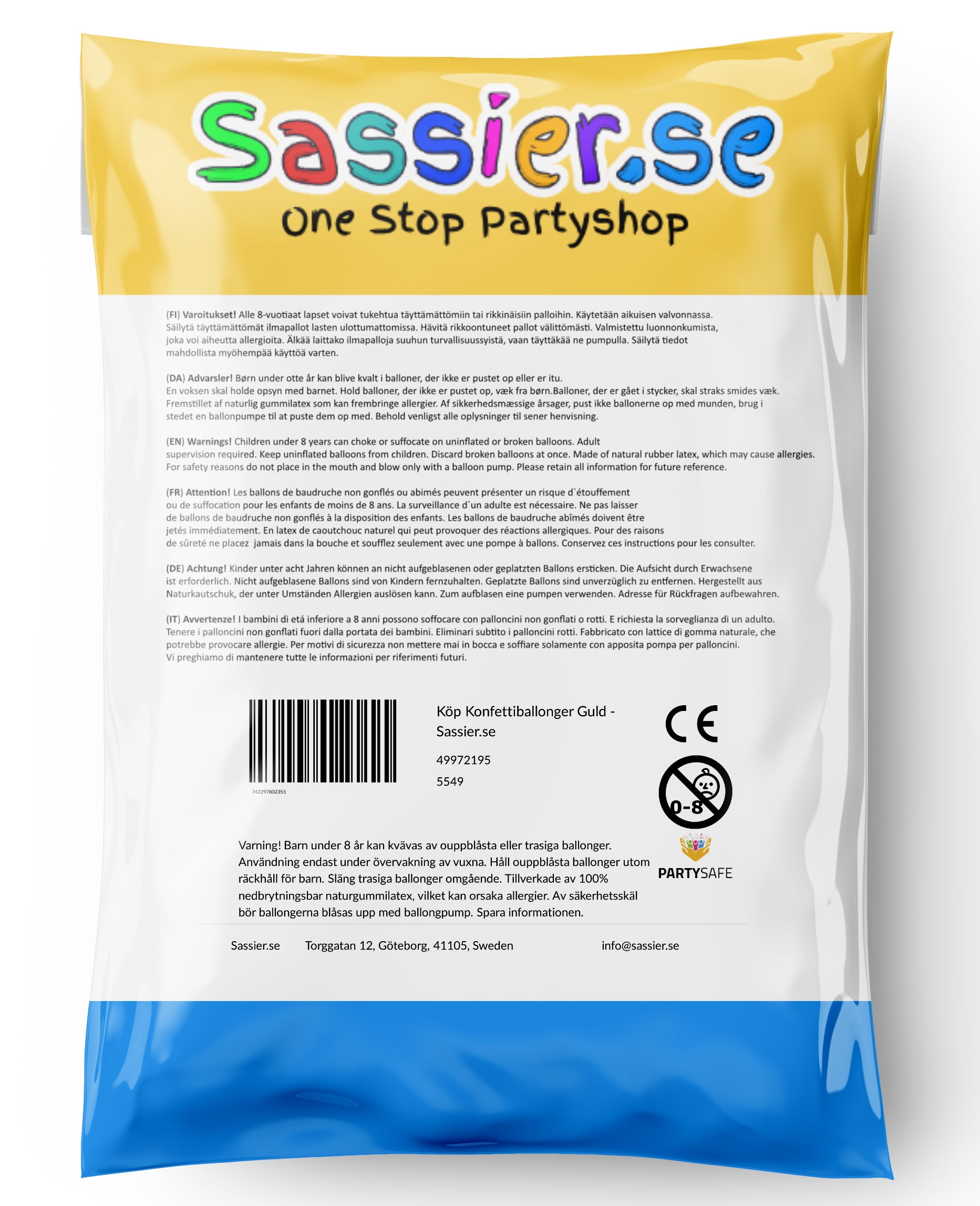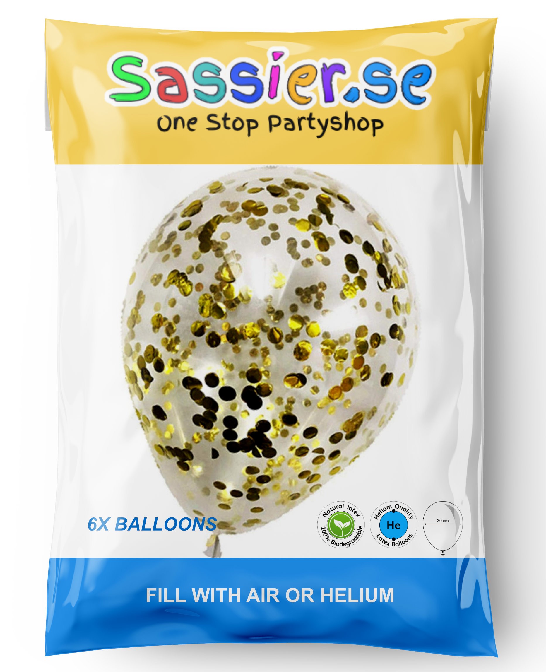 - Vid köp får du ett 6-pack konfettiballonger i biologiskt nedbrytbar naturgummilatex med guldfärgad konfetti och en uppblåst storlek på cirka 30 cm.