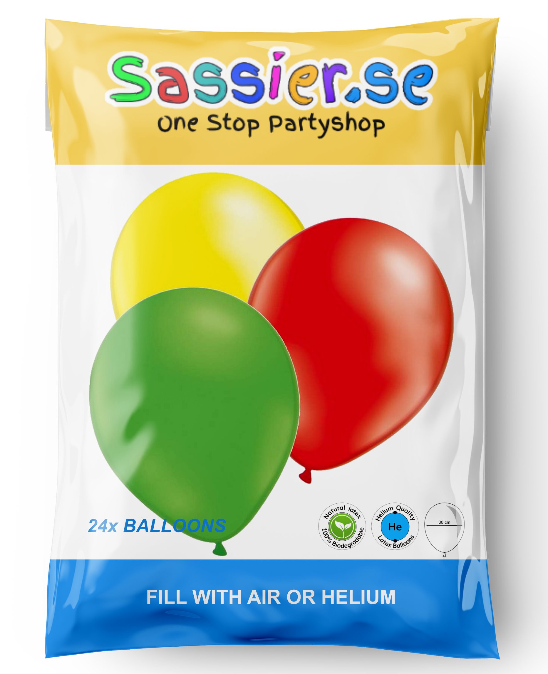 - Du får ett 24-pack biologiskt nedbrytbara latexballonger i rött, grönt och gult, 30 cm stora och avsedda för fest- och juldekoration.