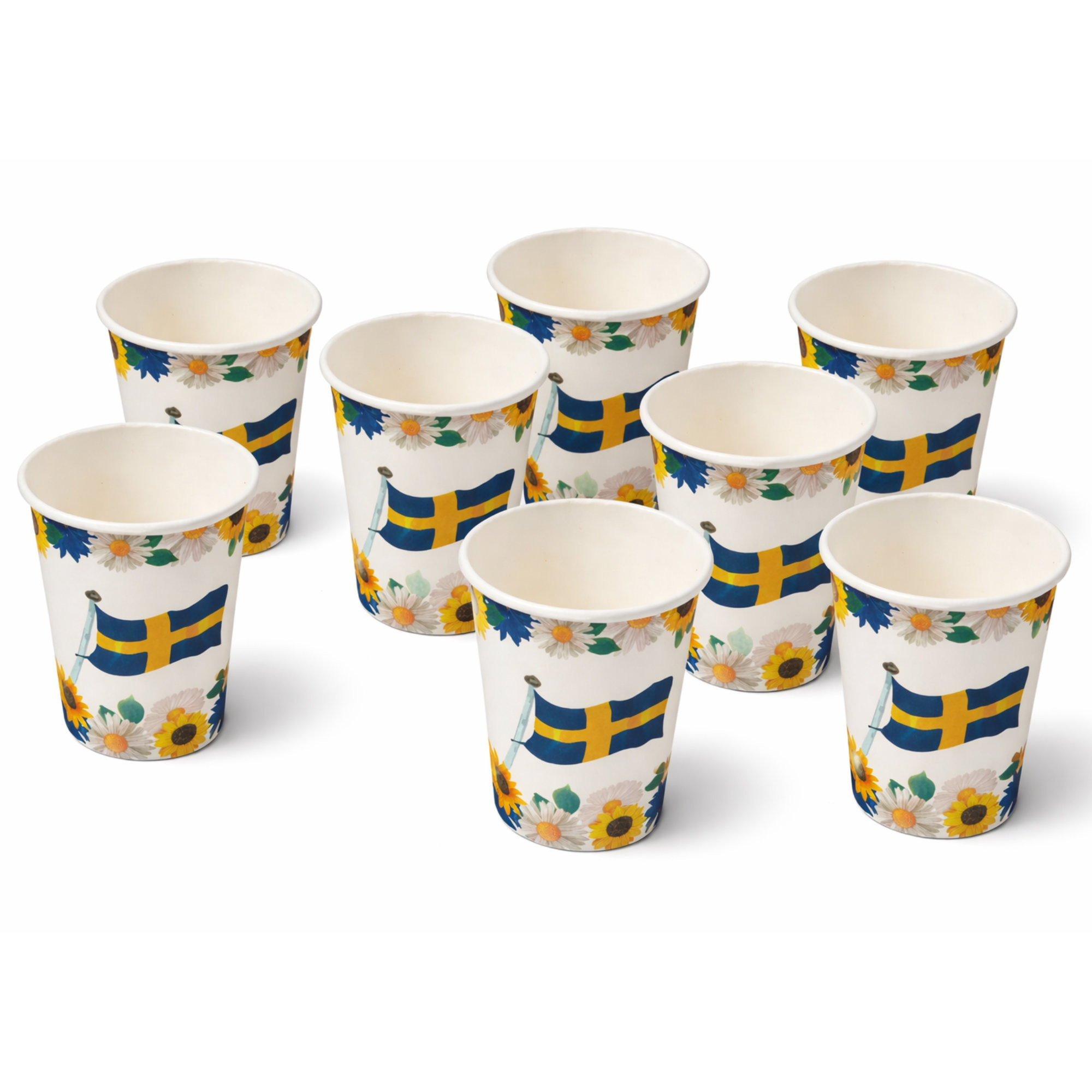 Skapa en enhetlig och festlig dukning med blommönstrade pappersmuggar i blågult. Dessa engångsmuggar till fest kombinerar dekorativ design med praktisk funktion och passar perfekt till midsommar, student och andra sommarfiranden. Ett smidigt val för dig som vill slippa disken och samtidigt behålla en genomtänkt dukning.